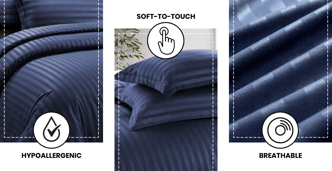 Give your bed a classy and updated look with this Microfiber stripe design Duvet Cover set and enjoy a cosy, luxurious feel. Navy stripe bedding blends perfectly with light shades. Style with white stripe duvet covers or balance with grey stripe duvet covers.